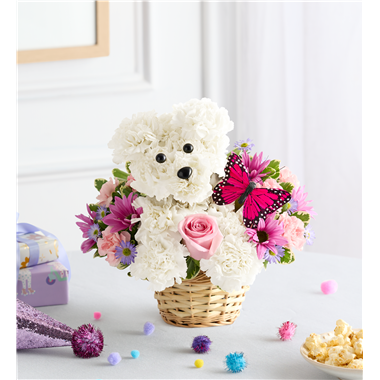 EXCLUSIVE Our truly original 3D pup is a precious Mother’s Day surprise. Crafted from white carnations, with sweet pink blooms all around and a butterfly accent, this canine creation is designed in a dog bed basket. For more happy wishes, add our festive “Happy Mother’s Day” balloon.